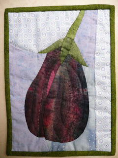 Als Beispiel seht Ihr hier eine Aubergine, die ich von Uli zum Geburtstag bekommen habe. Vorlage war die Aubergine aus dem Buch "Patchwork-Gemüse" von Ruth McDowell